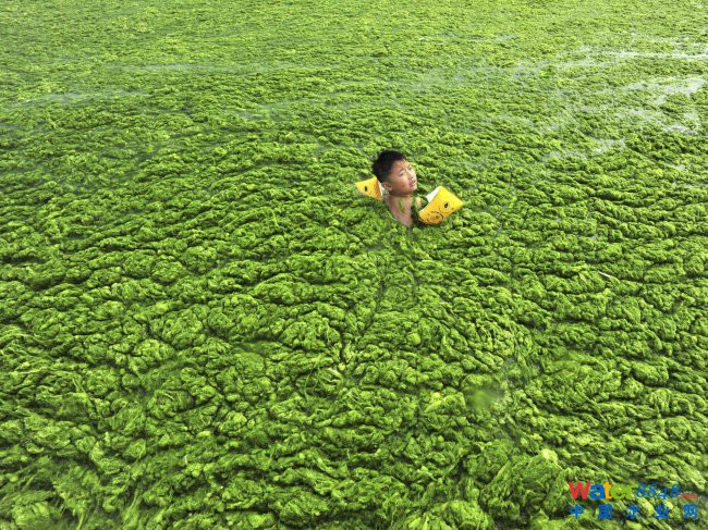 2006年7月18日,中国东部的安徽省合肥,孩子们在布满绿藻的河水里垂钓。