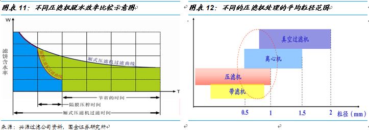 用于机械脱水的压滤机种类众多,主要包括板框压滤机、厢式压滤机和带式压滤机三类;其中新式板框压滤机(隔膜压滤)凭借脱水率高、能耗少等优点正逐步成为主流。
