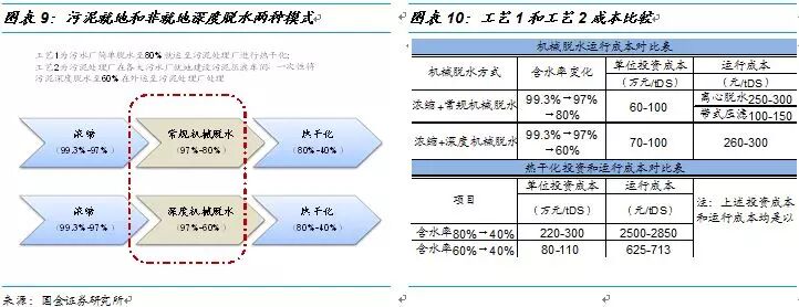 一般污泥经过浓缩后,含水率降至97%左右,还需进一步机械脱水和热干化以脱出吸附水和毛细水;根据外运污泥是否脱水至60%左右还可分为就地和非就地深度脱水模式两种模式,通过比较两者投资和运行成本,我们认为先行在厂区就地脱水至60%,在运往污泥处理厂进行热干化是更为经济性的方式。