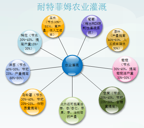耐特菲姆农业灌溉系统和产品能为多种农作物和果树提供针对性的灌溉方案,实现节水、节肥、节省成本和提高产量的目标。