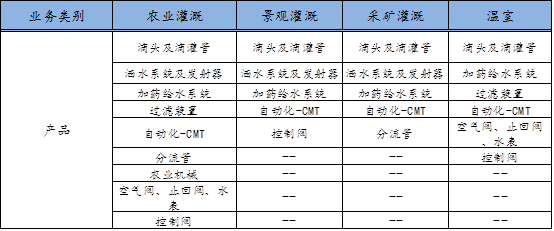 耐特菲姆有两块主要业务,灌溉(Irrigation)和温室(greenhouse),其中灌溉还分农业灌溉(Agriculture)、景观灌溉(Landscape)和采矿灌溉(Mining)。