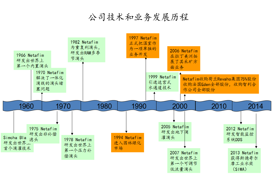 2008年,Netafim收购荷兰Revaho集团(欧洲领先的温室灌溉和方案供应商)75%股份,收购法国Eden(最大的园林灌溉和方案供应商)全部股份,收购智利合作公司全部股份;