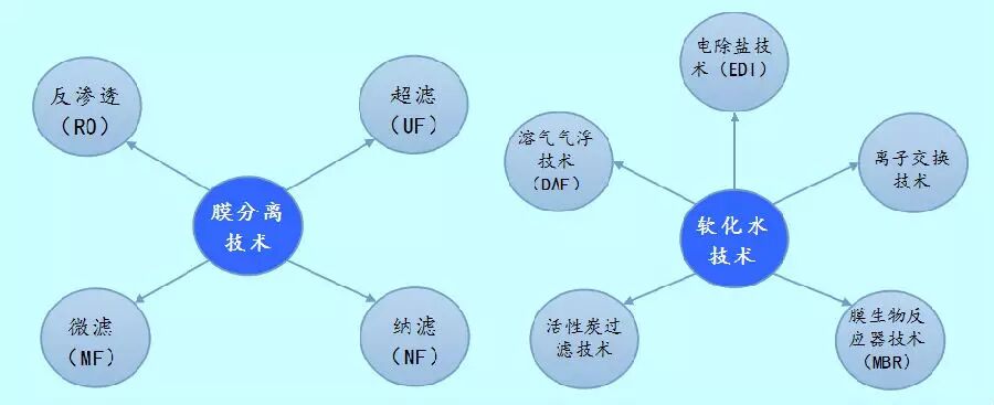 软化水技术:电除盐技术(EDI)、离子交换技术、溶气气浮技术(DAF)、活性炭过滤技术、膜生物反应器技术(MBR).