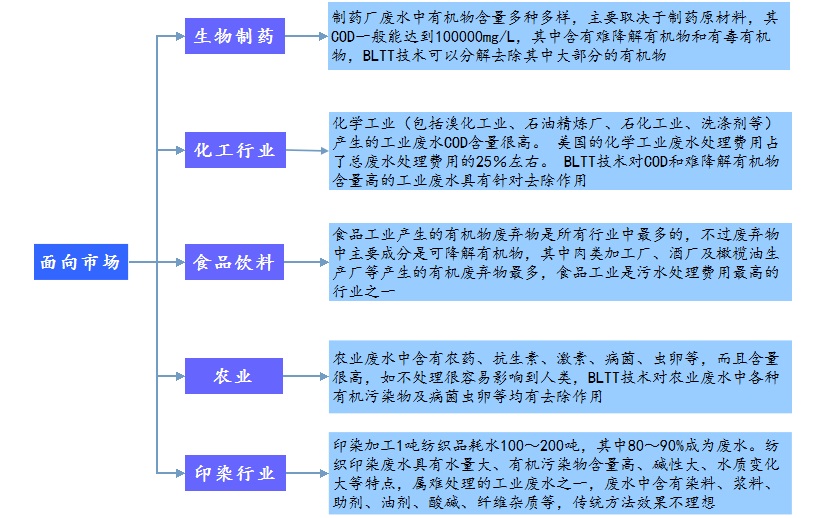 公司设备和技术应用广泛,尤其对高浓度COD废水有良好的净化作用,生物制药、印染、化工、食品饮料和农业等行业产生的废水均含有高浓度COD,是BLTT应用的针对性行业。