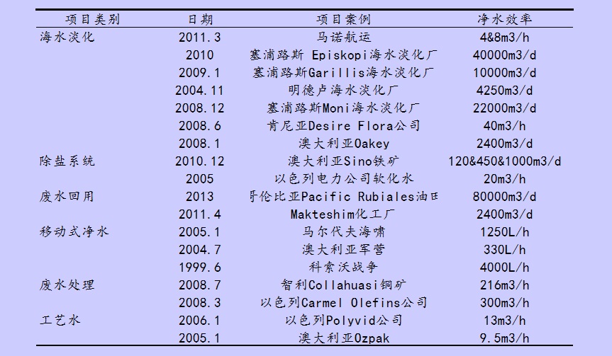 公司海水淡化、除盐系统、废水回用、移动式净水、废水处理及工艺水等各种项目均在国际上得到应用。