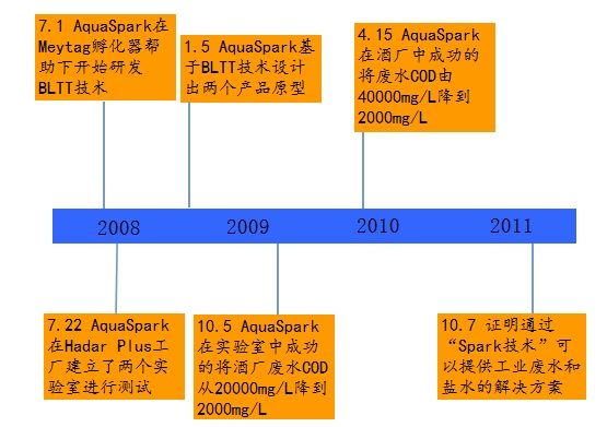 AquaSpark于2008年成立于以色列Katzrin,由废水处理专家Aaron Kitaev和其同事以及Meytag科技孵化机构共同创立,AquaSpark是一个以高浓度COD废水处理为主要业务的创业型企业,公司团队主要由化学、生物技术和清洁技术等领域的工程师组成,核心技术是 Aaron Kitaev开发的BLTT技术,公司提供基于BLTT技术的一体化废水处理装置,使COD含量极高的废水经过处理后达到城市污水管道的进水要求。