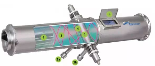 注:1、中压紫外灯;2、自动化实时控制与监测;3、可回收紫外线的光纤管;4、厚壁石英管及短灯