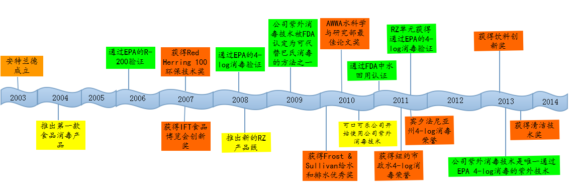 2005年,安特蓝德公司推出了 R-系列紫外消毒产品;2008年,推出了RZ-系列产品。两种产品系列都采用内部全反射原理,并且在设计上实现了紫外线剂量的均匀分布,可提高产品的消毒效率,同时降低了机器损耗和运行成本。