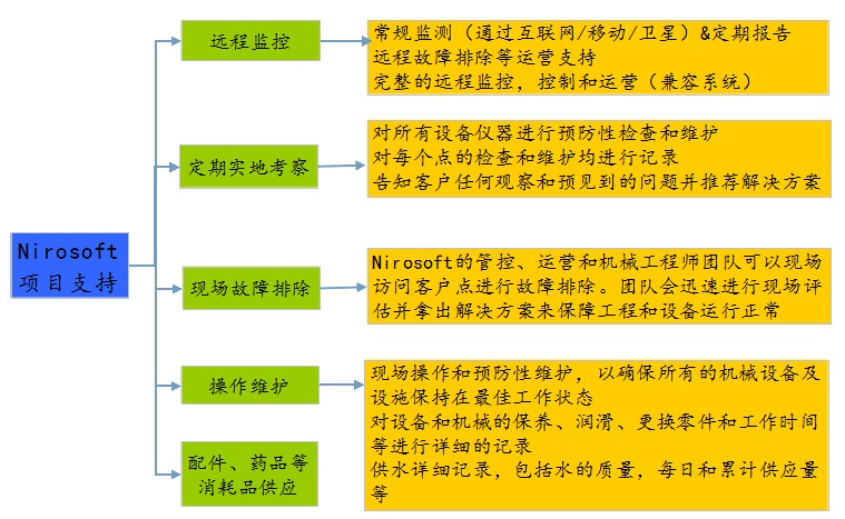 Nirosoft为客户提供一个从设计、制造、调试和售后服务的整体解决方案,包括交钥匙项目、BOT、DBO等。公司项目灵活,可根据客户要求和现场情况进行设计,项目的每个阶段公司均积极参与,通过实地考察、现场调试安装、咨询及远程监控等为客户提供持续的支持和服务。