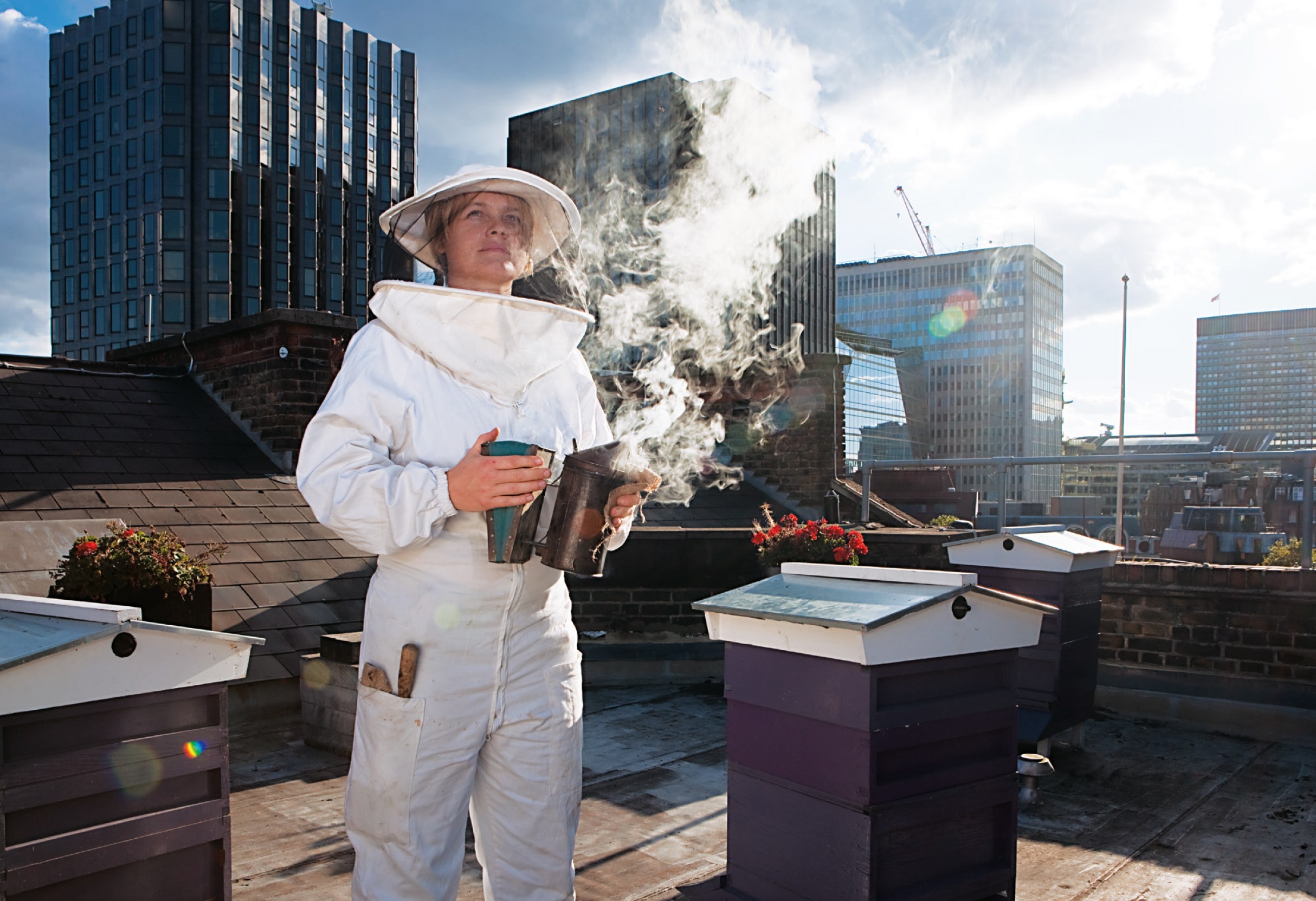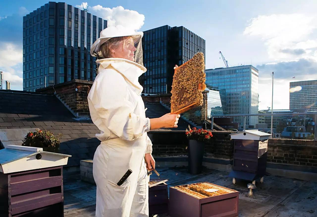 卡蜜拉正在伦敦的圣尔敏酒店顶楼天台准备收获蜂蜜。