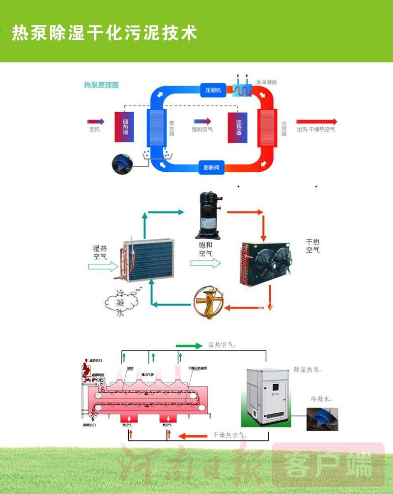 据中原环保股份有限公司相关负责人介绍,经过近2年多的研发,一种污泥闭环热泵低温的干化机试验成功,其工作原理是通过干化机利用热泵出口的热风,将污泥中的水分蒸发带走,经过滤再循环使用湿空气中的水分凝结干化机加热污泥。与传统的污泥热干化系统相比,可以将原来损失的90%供热量循环使用,整个加工过程没有任何废热排放,全部是通过污泥产生的能量对自身进行再加工。