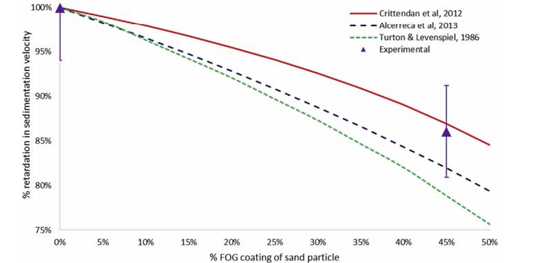 ▲ 沉降速率阻滞百分比与FOG成分比例的模拟数据和实测数据对比