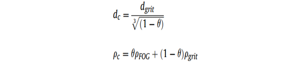 测试结果显示FOG包围层可以占到固体颗粒总体积的45%,根据这个数值,以FOG 的密度为880kg/m³来计算,沉降速度的减少率为13-14%。但计算结果显示颗粒的粒径对沉降速度比率没有明显影响。