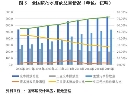 2006-2015年我国的废水排放总量持续增长,生活污水排放量总量上升,占比逐年提高,2015年超过50%,工业废水排放总量出现回落趋势。