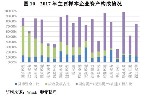 兴源环境和东方园林承接的EPC、BOT和BT工程建设项目较多,导致2017年未结算的工程项目为主的存货占比较高,分别为42.05%和35.41%,因此其非流动资产占比不如其他样本企业高,但资产实质都是已完工或在建的水处理设施或其他环保工程项目。
