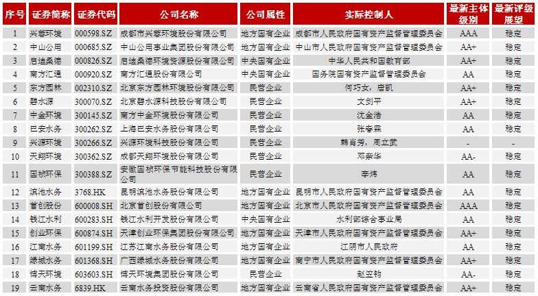 涉及污水处理业务的已发债企业有87家,其中有63家企业是非上市公司,58家属于当地政府下属的区域性水务运营平台,民营和外资控股参股的区域性水务运营公司各2家,央企1家。级别AA的25家,AA-的5家,AA+的14家,AAA的3家。已发债的上市公司24家,为了方便数据对比,本报告剔除了污水处理业务占比极少的5家,选择其中19家企业作为研究对象。