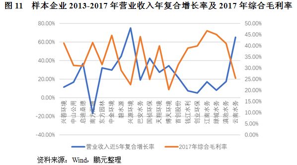 2017年收入规模最大的是东方园林和碧水源,分别为152亿元和137亿元,2013-2017年营业收入年复合增长率最高的依次是兴源环境、云南水务、碧水源、国祯环保、启迪桑德、博天环境和东方园林,分别是75.16%、65.20%、44.78%、42.45%、36.65%、34.39%和32.28%。从2017年综合毛利率来看,江南水务、绿城水务、中金环境、巴安水务、南方汇通、兴蓉环境和滇池水务排名前列,均保持在41%-46%之间,云南水务、国祯环保、兴源环境和博天环境排名靠后,但也保持在20%以上。