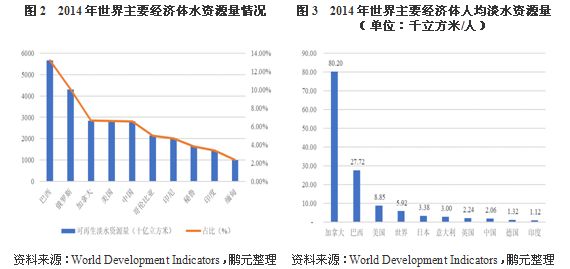 根据THE WORLD BANK相关报告,2014年我国水资源总量为2.81万亿立方米,占世界水资源总量的6.57%,仅次于巴西、俄罗斯、加拿大、美国,居世界第五位,但人均水资源占有量只有2,061.91立方米,占世界人均水资源量的34.85%,为世界人均水资源贫乏[1]的国家之一。