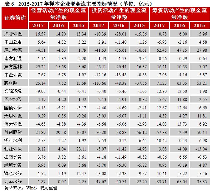 东方园林、兴源环境、云南水务、启迪桑德和博天环境由于工程建设收入占比较高,收现比略差。碧水源、东方园林、启迪桑德、首创股份和云南水务近年发展步伐比较快,投资活动的资金支出较大。兴源环境近年并购频繁,从环保设备制造延伸至下游施工和运营项目,积极开展项目投标、开拓市场,获取更多的PPP项目订单,对PPP项目实施建设投入资金,近三年的经营活动现金流和投资活动现金流持续净流出。