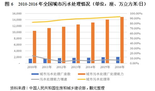 污水处理行业政策导向明显,受国家产业政策和环保投资规模影响大;目前城市市政污水处理市场逐渐饱和,扩能提标改造仍有市场机遇,新兴城镇及农村市场发展潜力较大。在我国城镇化进程加快、水资源紧缺、水污染加剧的背景下,国家日益重视环境保护。截至2017年6月底,全国城镇累计建成运营的污水处理厂4,063座,污水处理能力1.78亿立方米/日(2007年末仅为7,138万立方米/日),城市市政市场逐渐饱和,但老旧管网设备更新及提标改造等仍带来市场机遇。此外,污水处理行业“十三五规划”、《水污染防治行动计划》和《国家新型城镇化规划》等文件对全国所有县城、重点镇的污水处理能力提出了新的要求,并提出要积极推进城镇污水处理设施和服务向农村延伸。