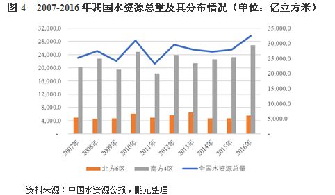 受地理、地形以及气候等因素影响,我国水资源分布不均,总体呈现出“东丰西乏,南多北少”之势。根据《中国水资源公报》,2016年我国水资源总量为32,466.4亿立方米,其中南方4区[2]26,873.7亿立方米,占比82.77%;北方6区[3]5,592.7亿立方米,占比仅17.23%。