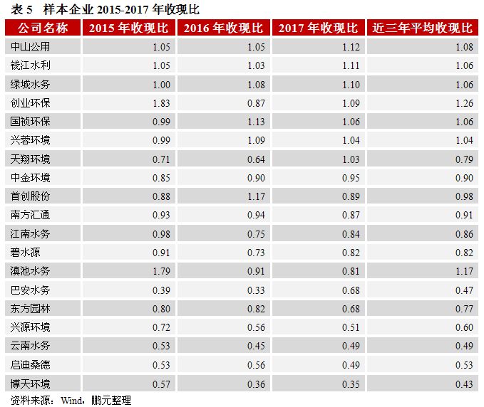 从收现比来看,以水务运营为主的中山公用、钱江水利、绿城水务、创业环保、国祯环保、兴蓉环境收入变现能力最强,近三年平均收现比都维持在1.00以上。区域性水务企业大多没有较大的规模扩张意愿和动力,经营表现较为稳定,收入质量较高,经营现金流表现也较好。