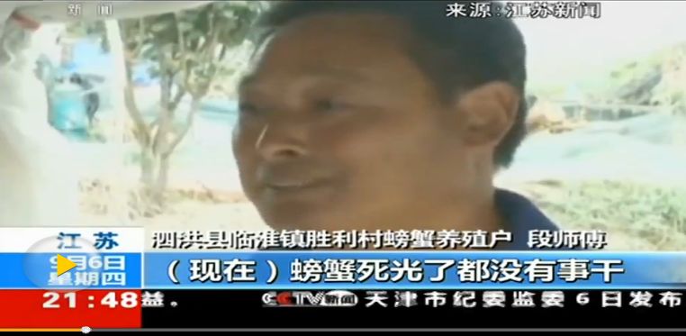 河水发黑,气味刺鼻,突然而至的大量污水造成江苏省宿迁市泗洪县洪泽湖畔数万亩水产养殖去受损严重。其中泗洪县临淮镇胜利村的万亩大闸蟹产区几乎是在一夜之间就由丰收的喜悦变化了绝望。