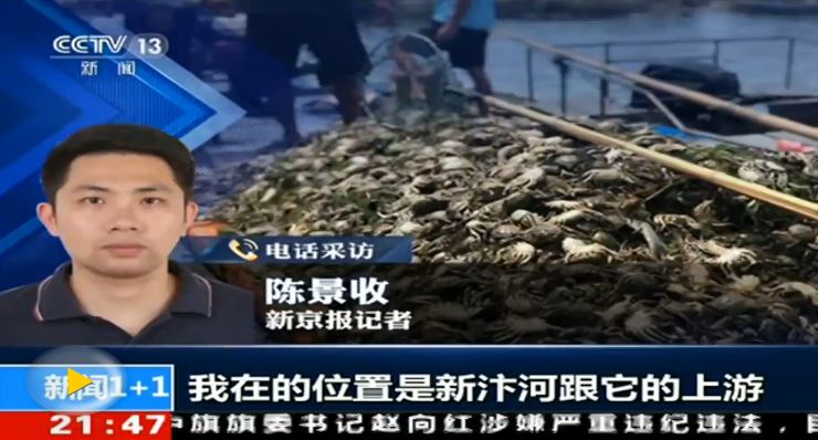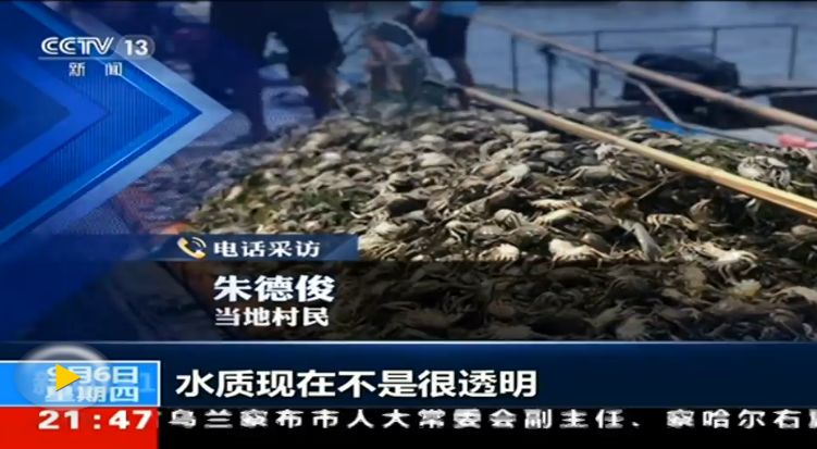 晚上好,欢迎收看正在直播的《新闻1+1》。在江苏洪泽湖两岸的养殖户,应该这些天在期待着他们一年一度的丰收,但是一场洪水过境,却让他们的损失极其的惨重。我们来看几张照片,这个是8月27日拍摄的,已经死了的螃蟹浮在湖面上。这个是渔民在捞死蟹,有鱼、有蟹,还有虾,关键是你看这个水面是什么颜色?是黑色,洪水过境怎么会是黑色的?根据判断目前安徽、江苏两地的环保部门做出的初步判断,是这一次上游的安徽在泄洪的时候是夹带着污水造成。截止到今天,事件发生已经13天过去了,媒体在追问,大家也在反思,关键的问题是这个污染是怎么造成的,我们今天一起来关注。