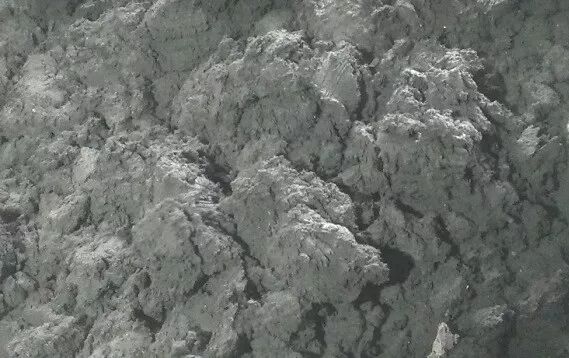 这是深度脱水以后的污泥,是固态片状的,细小颗粒也很多,孔隙减少。