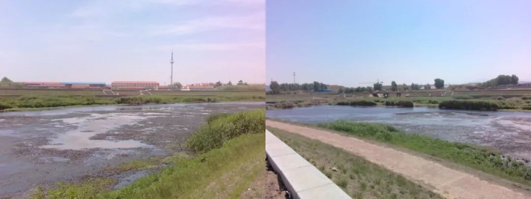 这是山东墨水河清淤工程。这是处理之前整个河道瘀积的情况,这个是处理后的对比情况。