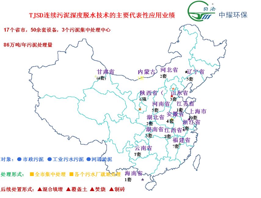 截至目前应用案例有40多个,主要对象是市政污泥、工业污水污泥、河道淤泥。承包形式有总包或者设备供货,还包括运营。后期运营管理我们也是可以做下来的。处理形式有的是全市集中处理,或者各个污水处理厂的就地处理。后续处置形式有混合填埋、覆盖土、焚烧、制砖等等。这是目前我们在全国各地做的一些项目,这是分布情况。这是我们主要代表性业绩。