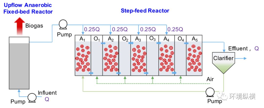 基于上述A-2B工艺,本团队将时间维度的连续缺氧/好氧交替转换到空间维度,将厌氧氨氧化置于缺氧段,研发了单级主流厌氧氨氧化工艺并与厌氧工艺耦合。如图3所示,分段式进水反应器间隔设置缺氧/好氧交替单元,原水经厌氧反应器(UAFBR)处理后以连续流模式分段进入A1-A4缺氧池中。厌氧氨氧化菌固定于生物填料上并持留在缺氧池中,而悬浮污泥可在系统内循环。