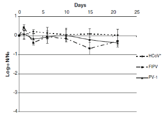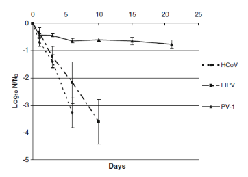 猫传染性腹膜炎病毒(FIPV) (ATCC-990):一种猫科动物的肠道冠状病毒,在克兰德尔里瑟猫肾细胞系(CRFK) (ATCC-94)中繁殖和检测。人冠状病毒229E (HCoV) (ATCC-740):一种呼吸道病毒,在胎儿肺成纤维细胞,MRC-5细胞系(ATCC-171)中繁殖和分析。脊髓灰质炎病毒1 LSc-2ab (PV-1):一种已知的在环境中非常稳定的人类肠道病毒,在布法罗绿猴肾(BGM)细胞系中繁殖和检测。在单层细胞中观察到细胞致病作用(CPE)后,将感染细胞在-20℃冷冻和解冻三次以释放病毒。随后在1000g离心10分钟以除去细胞碎片,加入到9%聚乙二醇(相对分子质量8000)和0.5 M氯化钠的病毒悬浮液中,并在4℃下搅拌过夜。在10000g离心30分钟后,用0.01 M磷酸盐缓冲盐水(PBS; pH 7.4)(Sigma, St. Louis, MO)重悬至原始病毒悬液体积的5%。然后将冠状病毒进行效价测定并储存在-80℃下。脊髓灰质炎病毒通过用等体积的Vertrel XF (Dupont, Wilmington,DE)提取进一步纯化,乳化后以7500g离心15分钟,随后收集顶层水层,进行效价测定并在-80℃储存。
