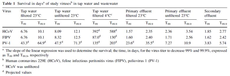 表1显示了三种病毒在测试水中的存活天数。每种病毒的对数减少量由公式“lgN/N0”计算,其中N是指定日期的病毒效价,N0是时间为0的病毒效价。线性回归的斜率用于确定存活率;病毒效价下降99%和99.9%所需的时间(分别表示为T99和T99.9)。