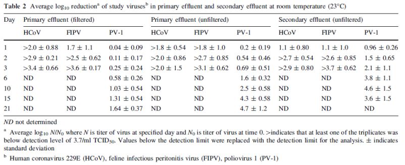 水中有机物和悬浮固体的存在可以为吸附在这些颗粒上的病毒提供保护,但同时如果这些固体沉淀下来,也可以成为去除病毒的一种机制。从自来水到二级出水再到一级出水,测试水中的有机物和悬浮固体含量都有所增加。过滤后的自来水比未过滤的自来水对冠状病毒灭活作用更强。此外,HCoV在未过滤的一级出水中的存活时间比过滤后的长。这表明较高的固体含量确实为水中的冠状病毒提供了保护。然而,对PV-1来说,过滤对其在自来水中的存活影响很小。在一级出水中,经过滤出水中的PV-1存活时间是未经过滤出水中的三倍。值得注意的是,在添加到废水中的时间和立即回收用于测试的时间(零时间点)之间,冠状病毒的效价显著降低。加入废水后,冠状病毒的效价立即下降了99.9%,而PV-1效价仅下降了10%。这种减少可能是由于废水中溶剂和洗涤剂的存在,它们会破坏病毒包膜并最终使病毒失活。这也可能表明冠状病毒比PV-1更容易吸附废水中的固体。病毒包膜的疏水性使得冠状病毒在水中的溶解性降低,因此增加了这些病毒粘附在固体上的可能性。废水样本必须经过过滤,以防止细菌污染细胞单层,这将去除颗粒物和任何与之相关的病毒。捕食性微生物如原生动物的存在可以增加水中病毒的失活率,蛋白酶和核酸酶也有这种作用(Gerba et al.1978; John and Rose 2005)。与二级出水相比,初级出水的细菌和固体含量都较高。所有三种测试病毒在未过滤的初级出水中的存活时间都比未过滤的二级出水长,尽管对FIPV来说这是可以忽略的。这再次表明,废水中的颗粒物相关病毒受到保护,不会被捕食和灭活。然而,冠状病毒在3天后低于最低检测限,而PV-1在21天后仍可检测到。废水中研究病毒的平均对数减少结果列于表2。