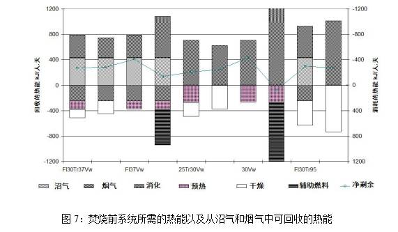 图7列出焚烧前系统所需的热能以及从沼气和烟气中可回收的热能。从中可以看出消化过程回收的热量在假定的消化条件下有一大部分又用于系统的保温。除机械脱水率低的20Vw方案外,所有其它方案均可不同程度地回收热能。计算中假定沼气和烟气的热能回收率为75%,在全干化的两个方案中(Fl30Tr95和25Tr95)取90%(相当于电厂热回收率)。