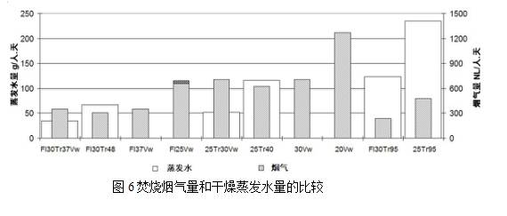 焚烧烟气量和干燥蒸发的水量分别是焚烧设备和热蒸发干燥设备规模的重要指标。图6将这两个指标列出2。由于污泥消化已将部分可燃物降解,所以烟气量均低于未消化污泥。如果机械脱水率高(Fl37Vw,Fl25Vw,和30Vw),仅通过预热燃烧空气便可实现自燃,不需要中间的干化。