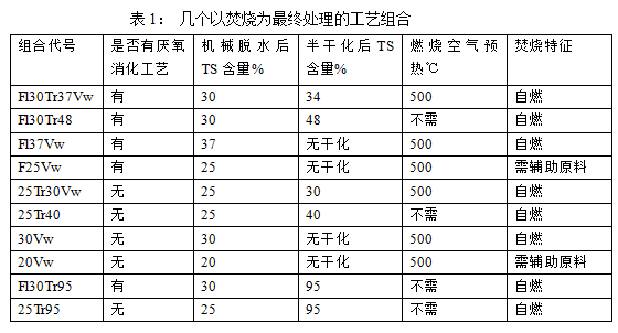 表1列出几个以焚烧为最终处理的工艺组合。以下为以实际工程为基础的几个方案比较,重点是物质流与能量流的量化,由此可进一步确认设施的复杂程度、大小与费用。