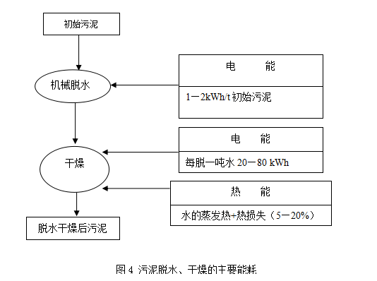 污泥的机械脱水是进一步处理的重要前提。如果将焚烧或其它热处理作为最终处理手段,则要求机械脱水效率尽可能高,因为机械脱水每处理一吨含水污泥需要1—2kwh 的能量(电能),而干燥时不仅需要一部分电能,而且需要大量的热能用于水的蒸发。图4概括了污泥脱水、干燥的基本能量流。
