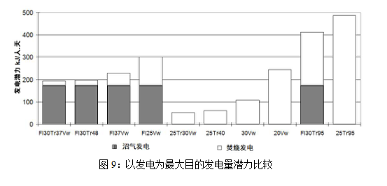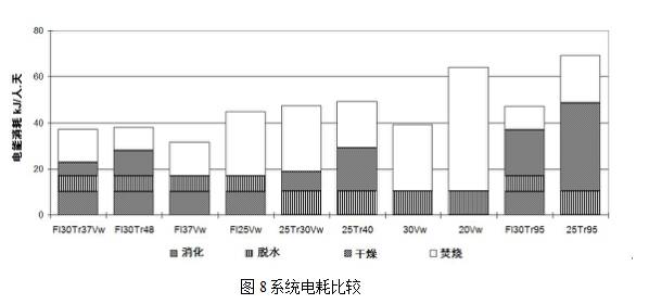 图8为系统电耗,在30-65KJ/人·天这样一个范围。图7中过程剩余热能在150-400KJ/人·天之间(20Vw除外)。取沼气转化电能30%,烟气热能转化为电能的25%,则剩余热能理论上所能转化的电能便与系统耗电在一个数量级上了。实际的系统中考虑到稳定性通常要有一定的余量,一次性投资的局限等,所以污泥焚烧过程的能量回收未必完全抵消系统的能耗。