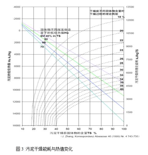 图3给出污泥干物质中不同挥发性固体物含量与污泥干物质含量及污泥低位热值的相关关系。计算中假设灼烧挥发份的热值为22,000KJ/Kg,图中还标出了污泥干燥时不同初始干物质含量及干燥后干物质含量与干燥所需最小理论热量。