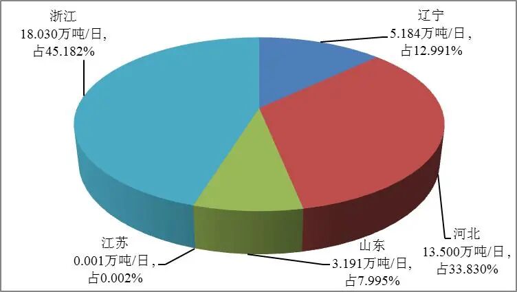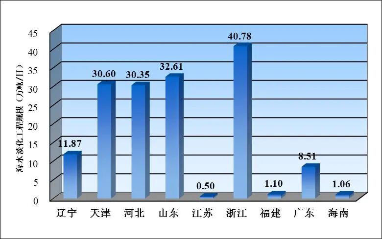 辽宁现有海水淡化工程规模118654吨/日,天津现有海水淡化工程规模306000吨/日,河北现有海水淡化工程规模303540吨/日,山东现有海水淡化工程规模326094吨/日,江苏现有海水淡化工程规模5010吨/日,浙江现有海水淡化工程规模407756吨/日,福建现有海水淡化工程规模11000吨/日,广东现有海水淡化工程规模85120吨/日,海南现有海水淡化工程规模10586吨/日。其中,海岛地区现有海水淡化工程规模388556吨/日。