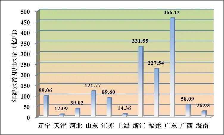 截至2019年底,辽宁、天津、河北、山东、江苏、上海、浙江、福建、广东、广西、海南11个沿海省市均有海水冷却工程分布(图6)。2019年,山东、浙江、福建和广东年海水冷却用水量超过百亿吨,分别为121.77亿吨、331.55亿吨、227.54亿吨、466.12亿吨。