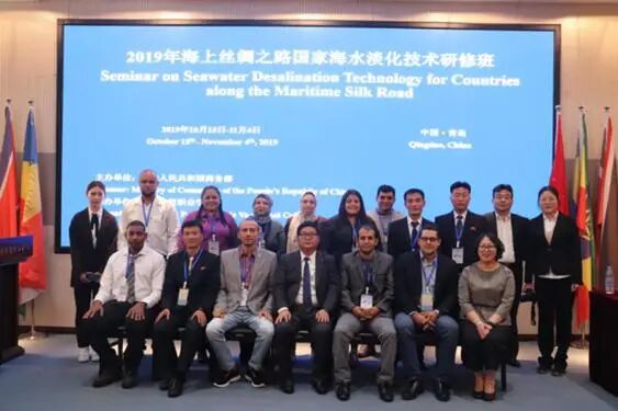 2019年10月15日,2019年海上丝绸之路国家海水淡化技术研修班(图11)在青岛开班,来自埃及、巴拿马、塞舌尔、朝鲜、牙买加、纳米比亚等国家的学员参加了此次培训。该研修班是商务部的援外培训项目,旨在提高发展中国家利用海水解决水资源短缺的能力,并为海水淡化技术的推广与交流合作提供契机。
