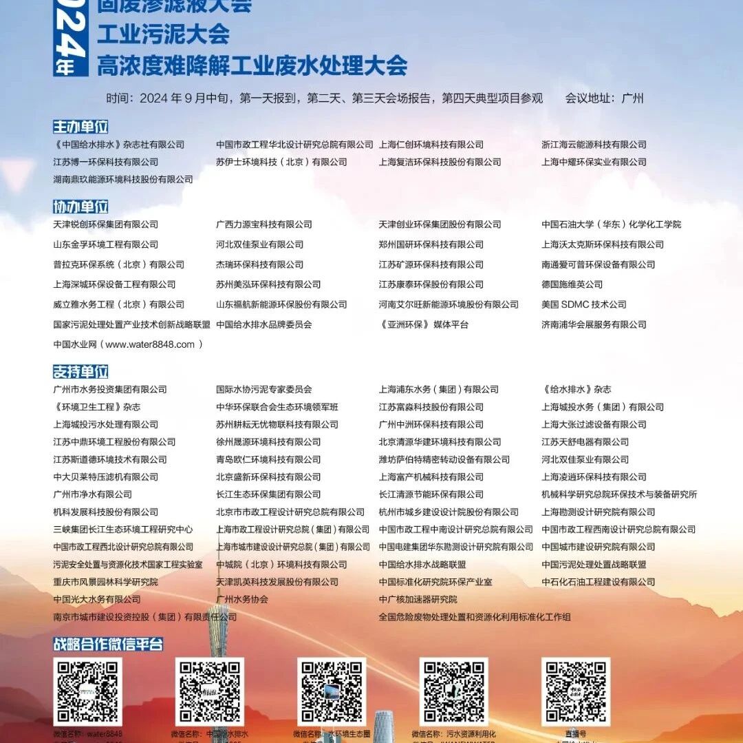 欢迎来自部委行业管理单位、高校、科研机构、设计院所、工程总承包(EPC)公司、水务集团、水务(排水)管理、污泥处理处置及资源化利用、工业(园区)污水与污泥处理、固废处理及资源化利用、垃圾渗滤液处理、污水处理厂、水环境综合治理、黑臭水体治理、智慧水务、污水资源化(再生水)利用、工业企业的水处理技术/管理专家等申请发言,作与会议主题相关的优秀报告。【王领全 13752275003 主办、协办、报告等;中国给水排水2024年污泥大会(第十五届)、污水大会(第八届,合肥)技术报告邀请中】