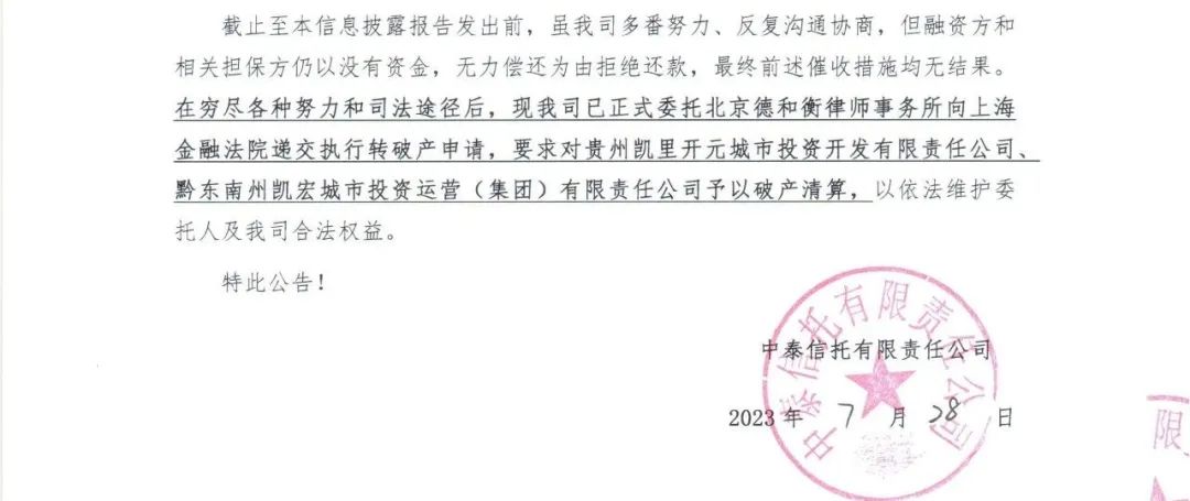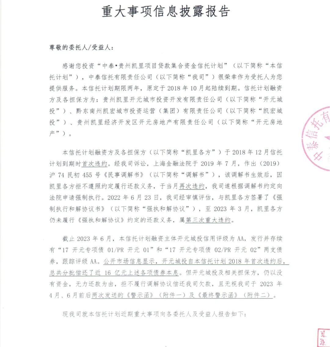 2023年7月28日,中泰信托发布“贵州凯里项目贷款集合资金信托计划重大事项信息披露报告”。报告显示,截至本信息披露报告发出前,融资方和相关担保方仍以没有资金,无力偿还为由拒绝还款,最终前述催收措施均无结果。