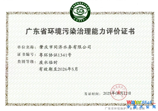 近日,广东省环境保护产业协会公布了2025年第一批广东省环境污染治理能力评价证书评审结果,同济环境·肇庆市同济水务有限公司成功获得这一重要认证。