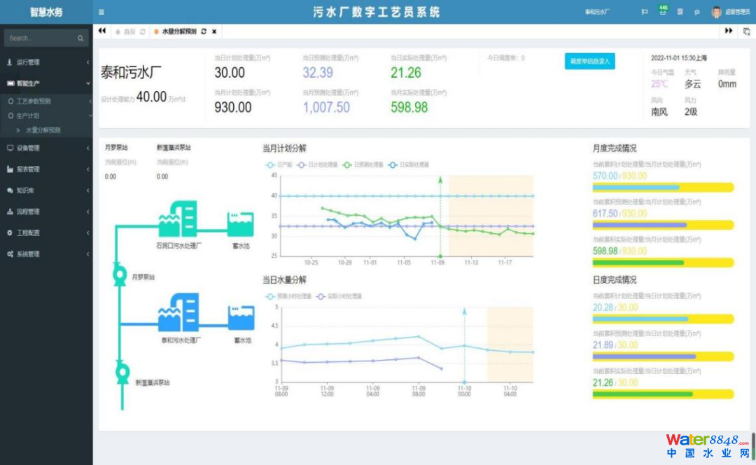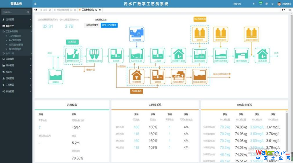 本项目基于污水处理厂高质量转型需求,总体目标是融合机理算法和机器学习算法,建立用于管控工艺生产的数字工艺员系统,形成24小时在岗的虚拟工艺员,以便对污水厂工艺生产进行全天候不间断的精细化自主调控,同时对于支撑污水处理高效运行的设备管理和安全管理工作进行有针对性的智慧化升级。