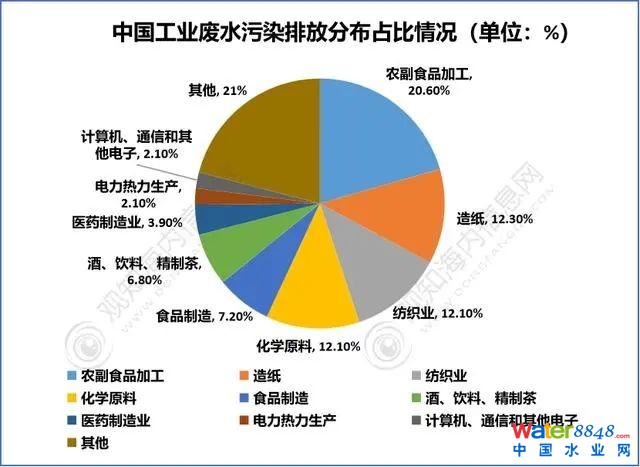 从我国工业废水污染物排放分布情况来看,农副食品加工业占20.60%,工业废水污染物排放量排第一位;第二是造纸及纸制品业,占12.30%;第三是纺织业、化学原料和化学制品制造业,各占12.10%。