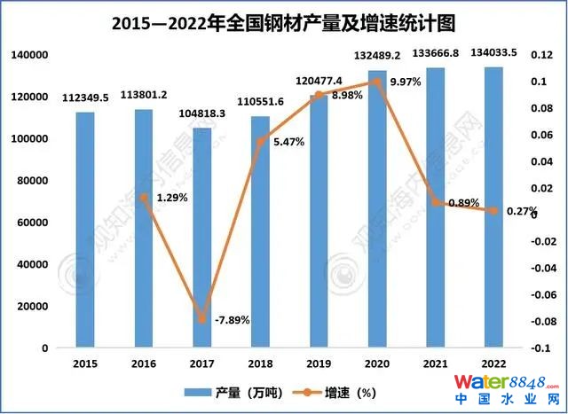 2015-2022年全国钢材产量及增速统计图